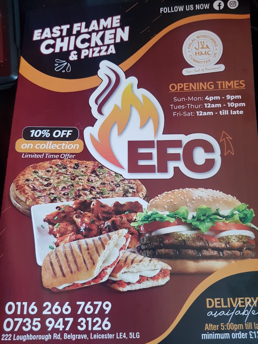 Introducing East Flame Chicken & Pizza, a culinary gem located at 222 Loughborough Rd, Leicester. Known for its mouthwatering pizzas, juicy burgers, and tender kebabs, this eatery has made quite an impression on food enthusiasts. The menu boasts a range of flavors, including the highly praised Meat Feast and Chicken Supreme, both celebrated for their generous toppings and satisfying taste.